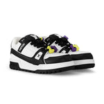 Présentée lors du défilé homme printemps-été 2023 de Louis Vuitton, la sneaker LV Trainer Maxi réinterprète la sneaker culte LV Trainer de Virgil Abloh avec une coupe oversize inspirée du prêt-à-porter. La tige en cuir de veau est dotée d'épais lacets en textile ornés de perles colorées reprenant les signatures Louis Vuitton. Ce modèle arbore les initiales LV sur la languette et des fleurs Monogram sur la semelle extérieure.