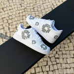 Cette paire est une personnalisation artisanale de la Nike Air Force 1 '07 classique, avec des imprimés appliqués à la main inspirés du motif « couronne » emblématique de Denim Tears. Le motif est appliqué directement sur le cuir de la chaussure grâce à des encres spéciales qui garantissent un fini durable et visuellement saisissant. Chaque paire étant personnalisée à la main, elle est unique et peut varier légèrement.
