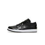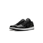 Cette Air Jordan 1 revêt une construction en cuir verni, chaque empiècement habillé de noir est poli à un point proche du miroir. En dessous, des panneaux assortis en cuir lisse se déploient sur le col, le panneau médian et l’avant-pied, créant une paire qui se distingue par sa palette de couleurs sobre.