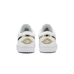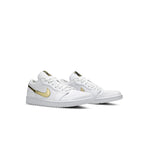 La Air Jordan 1 Low « White/Metallic Gold » pour femme est la première chaussure signature de Michael Jordan dans sa hauteur basse habillée dans un schéma de couleurs luxueux. Au fil du temps, la Jordan 1 Low est devenue connue pour sa sélection de couleurs axées sur le style de vie, et ce look « blanc/or métallique » ne fait pas exception à la règle. Toute la tige est recouverte de cuir blanc poli, y compris le bout perforé, le panneau intermédiaire, le col et le talon. Les Swooshes dorés métalliques de chaque côté apportent un look haut de gamme à la chaussure. Des détails dorés supplémentaires peuvent être trouvés sur le logo « Wings » brodé sur le talon, et sur la languette métallique avec insigne Jumpman blanc. Les lacets ton sur ton et la broderie blanche « 23 » sur la couverture en dentelle complètent le look de cette Jordan 1 Low en taille femme.